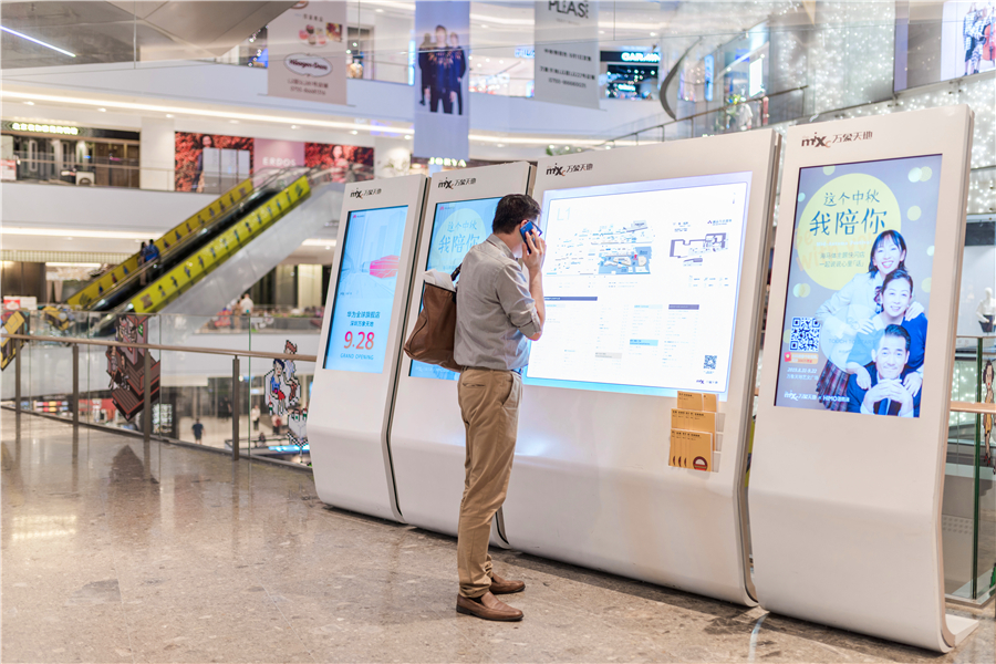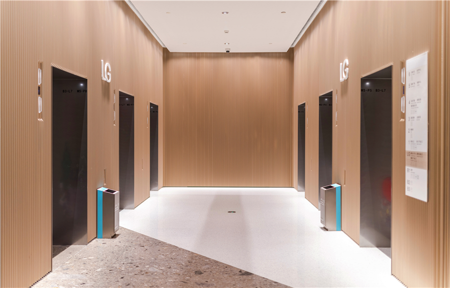 萬象天地導視系統整體簡約現代、且充滿設計感,在每一層設立服務臺,提供商場指引、指示牌、導視牌、樓層指南。全方位導視牌設置,且均布置在垂直電梯附近,美觀性與導視實用性相結合。