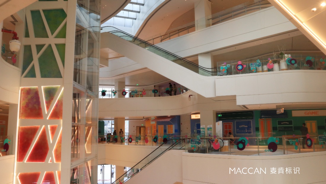 麥肯利用導視信息的碎片平面和合理分配,增加簡潔時尚的設計圖案,將整個區域打造成了休閑放松、愜意漫步的購物空間,極大滿足了消費者的心理。
