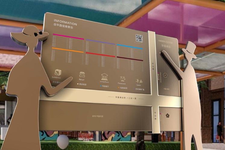 導視設計里的“華先生”,整體形態采用較為夸張的藝術手法,略去了五官輪廓,手腳形態抽象化,體態圓潤化,有時較為夸張的動態姿勢,在空間中表現更具親和力。在華盈里享受生活的同時,導視牌也不再局限于指引的功能,每一件導視作品都如一件藝術品,與人產生了共鳴。