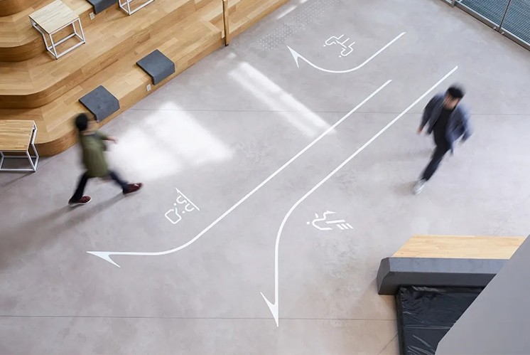 柱子、墻壁和地板上,箭頭與編號設計交織在一起,仿佛在講述一場體育賽事的故事。設計團隊巧妙地將體育精神融入工作環境,激發員工的團隊協作和競技熱情。編號設計不僅具有指示性,更通過其獨布局和色彩,空間充滿活力和節奏感。通過設置互動屏幕和信息點,員工可以輕松獲取最新的研發動態和合作信息。導視系統提升了空間的導航效率,通過游戲化的設計元素,增強員工的參與感和歸屬感。