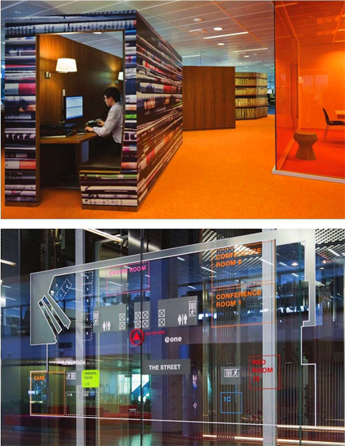 此外,結合整個辦公環境,每個樓層都要有與建筑本身色調相匹配的字體和主色,而且各樓層上標識的位置必須保持一致。此種設計將使空間的視覺效果大為提升。非正式的聚集場所也都擁有自己的獨特標識。各樓層的會議室被命名為“會議帳篷”;“聊天盒”用以命名信件收發室;就連操作室也被用以大膽、有趣的圖形來加以裝飾。