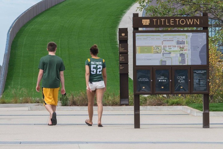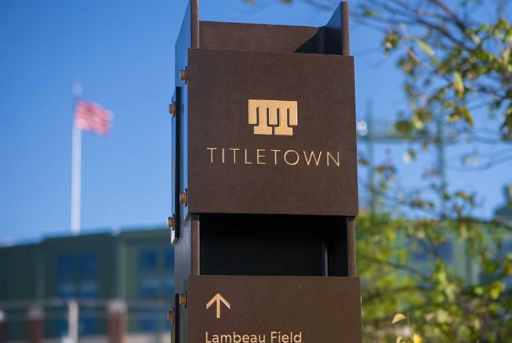Titletown 位于美國威斯康星州的綠灣是一個新的市民公園,為家庭和社區提供全方位的活動。Titletown 得名于 Green Bay 的昵稱,它贏得了 13 次 NFL 世界冠軍,是所有城市中最多的。該標識設計為圍繞足球門柱形狀的雙“T”字母組合。改市民公園的標牌和尋路元素整合了整個體育場和場地中的材料,功能強大、經久耐用,同時也能有效彰顯公園的精神。
