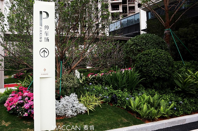 麥肯標識導視系統山水間流動的標識設計,如山河般錦繡如畫,通過對金屬材料的銑刻,如標識信息從頑石、流水間劃過,進入住宅群,還原純凈的心境,讓山河里成為獲得平靜的修心住所,在這里,草木皆是流動性,風撫動著綠意。