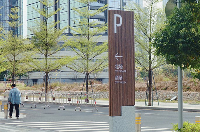 麥肯標識受邀為其標識導視服務,其設計巧妙地融合了石質與木質紋理,為現代金融地標增添了一份溫潤與雅致。導視牌的石質部分,選用上乘的天然石材,其紋理宛如歲月沉淀的詩篇,每一處木紋肌理都訴說著自然的鬼斧神工。石材的厚重質感與建筑的堅毅氣質相得益彰,仿佛是這座金融大廈穩固根基的象征,彰顯著一種堅不可摧的力量。